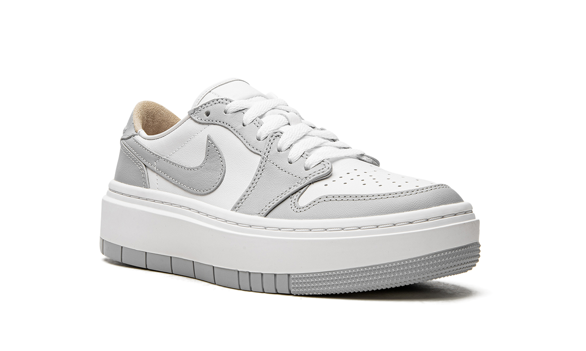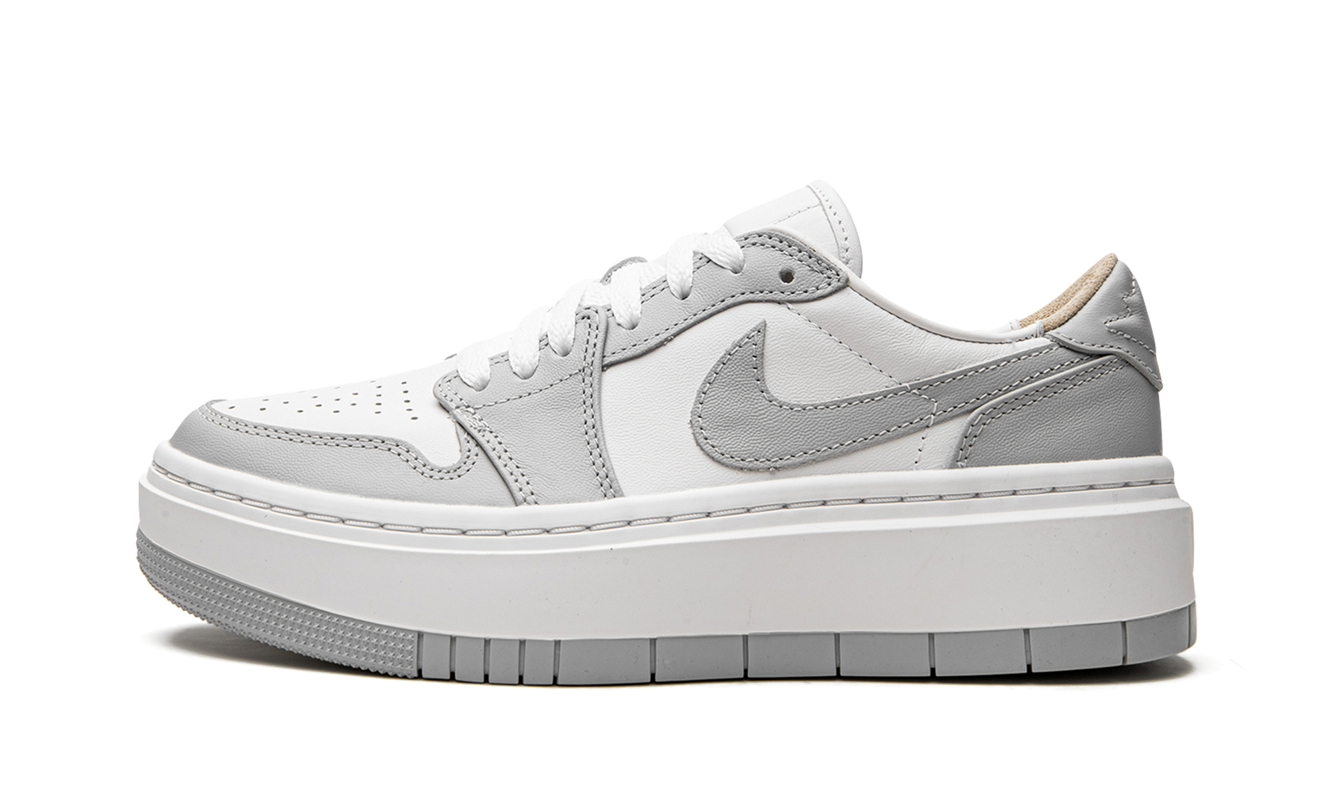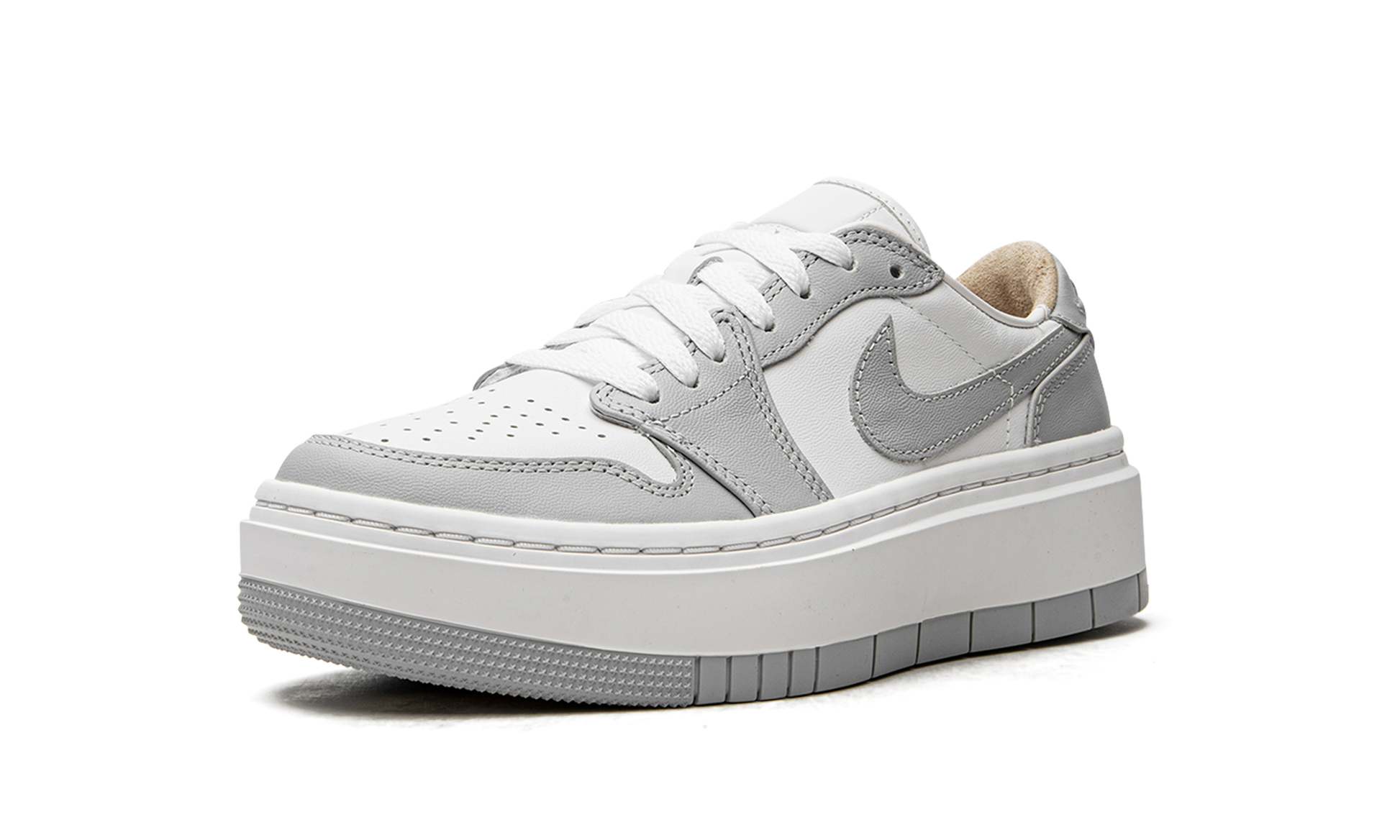 The Women’s Air Jordan 1 Low Elevate “Wolf Grey'' is an elevated take on Air Jordan 1 heritage with a simple two-toned white and grey color scheme. The platform Jordan 1’s foam midsole cushioning and cork sockliner deliver all day comfort. White leather uppers extend to the tongue and liner, before a slew of greyscale overlays covers this simple but aesthetically pleasing sneaker. Premium leathers and a crafted Wings logo on the heel tab help create balance between casual wear and opulent looks that fits right in with any outfit. Wolf Grey