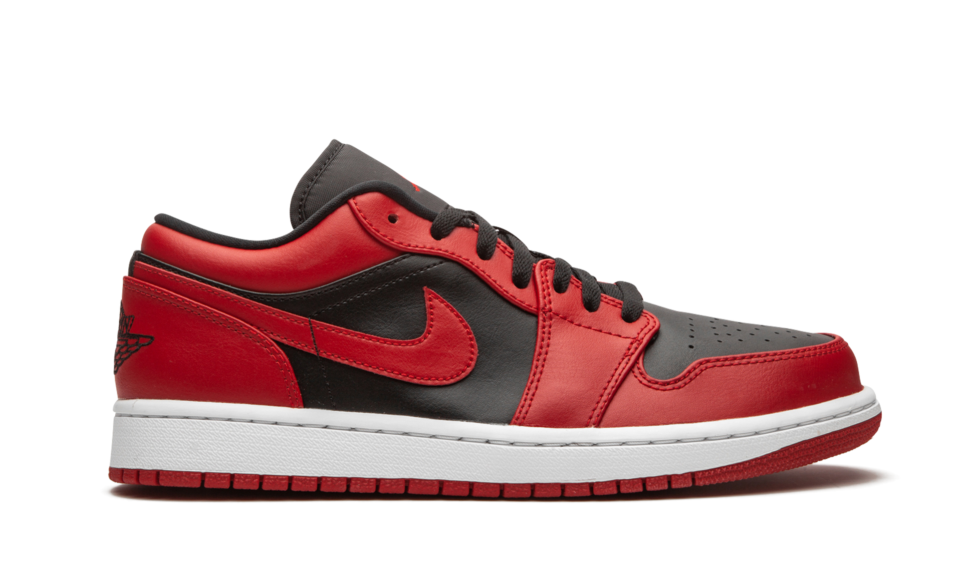 The Air Jordan 1 Low “Reverse Bred” rearranges the classic “Bred” color scheme on Michael Jordan’s first signature model in low-top height. The famous “Bred,” or black and red, colorway was one of several original makeups of the Jordan 1 worn by Michael during the early stages of his time with the Chicago Bulls. Years after its release, it still shines as one of the very best Air Jordan designs ever. This “Reverse Bred” flips the look by employing black leather on the perforated toe and mid-panel. Red leather overlays appear on the forefoot, eyelets, collar, and heel. Branding appears in the form of a red leather Swoosh on either side, black embroidered “Wings” detailing on the heel, and a mini red Jumpman stitching on the black nylon tongue. Tonal laces and a black liner add depth to the design. As a whole, the Air Jordan 1 Low “Reverse Bred” is reminiscent of the “Varsity Red ‘85” colorway used on the Jordan 1 High. Reverse Bred