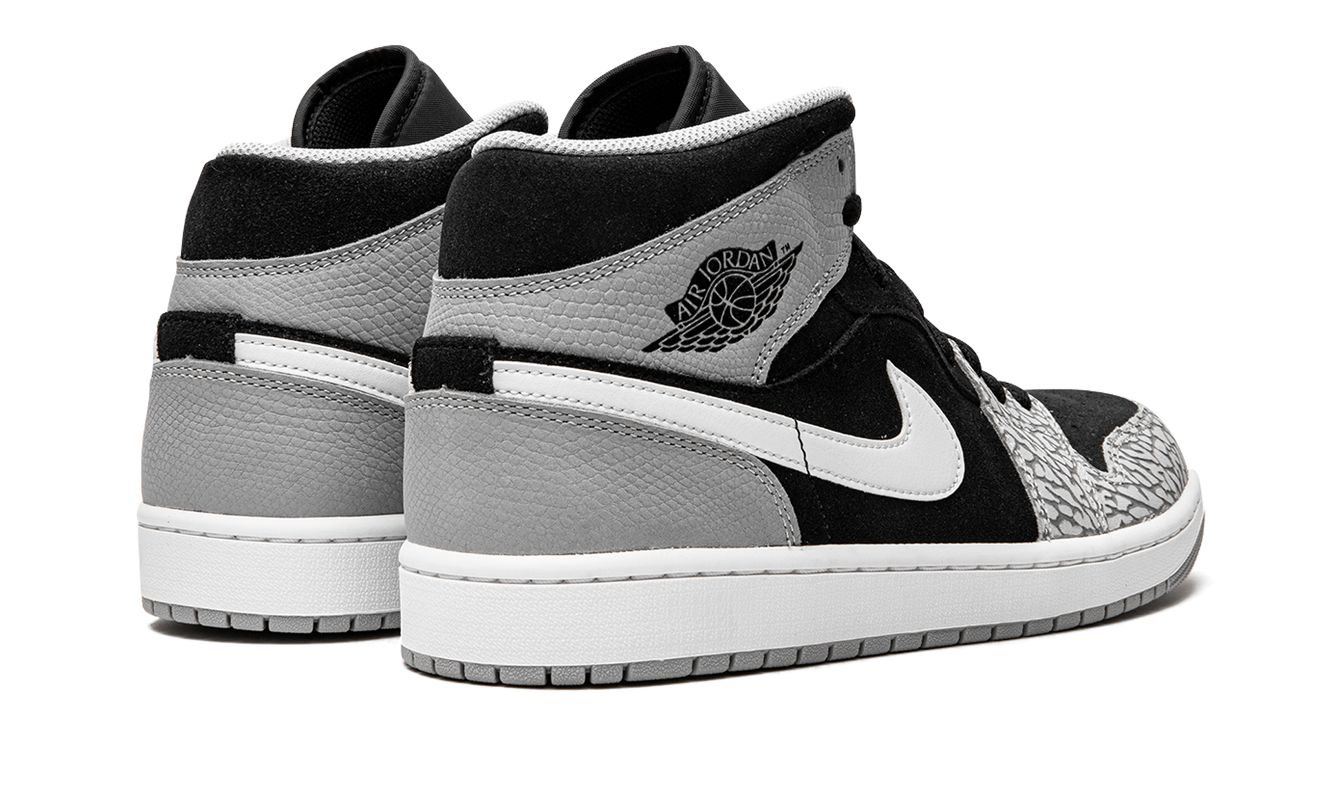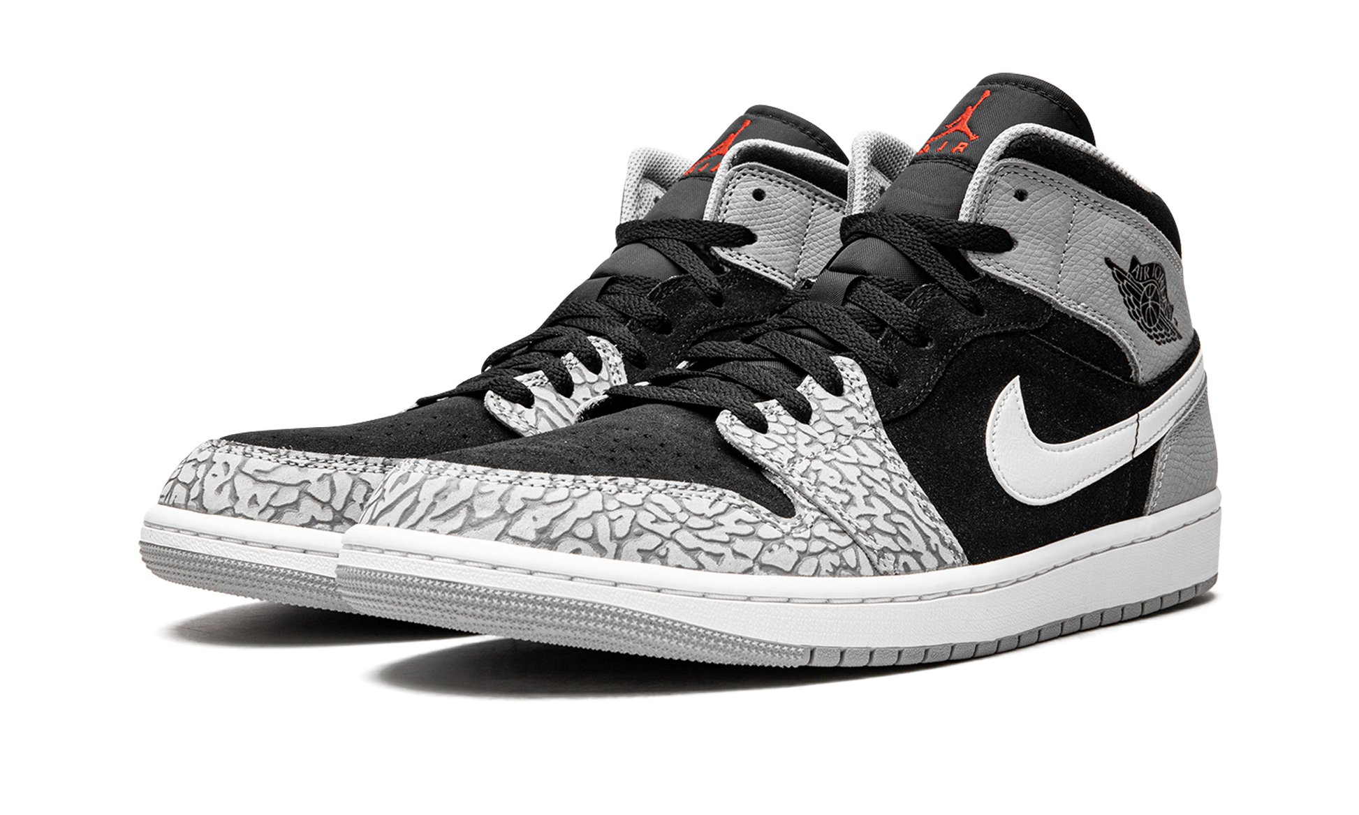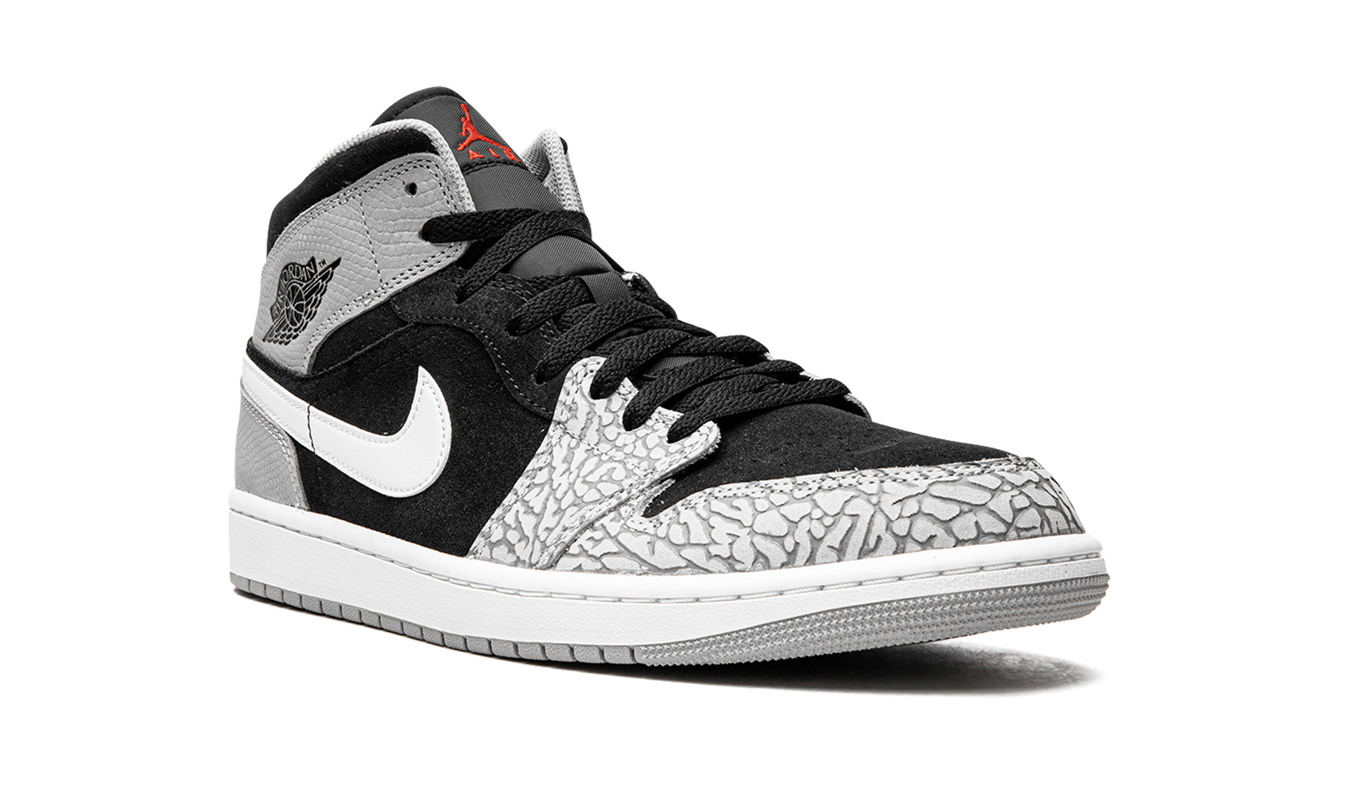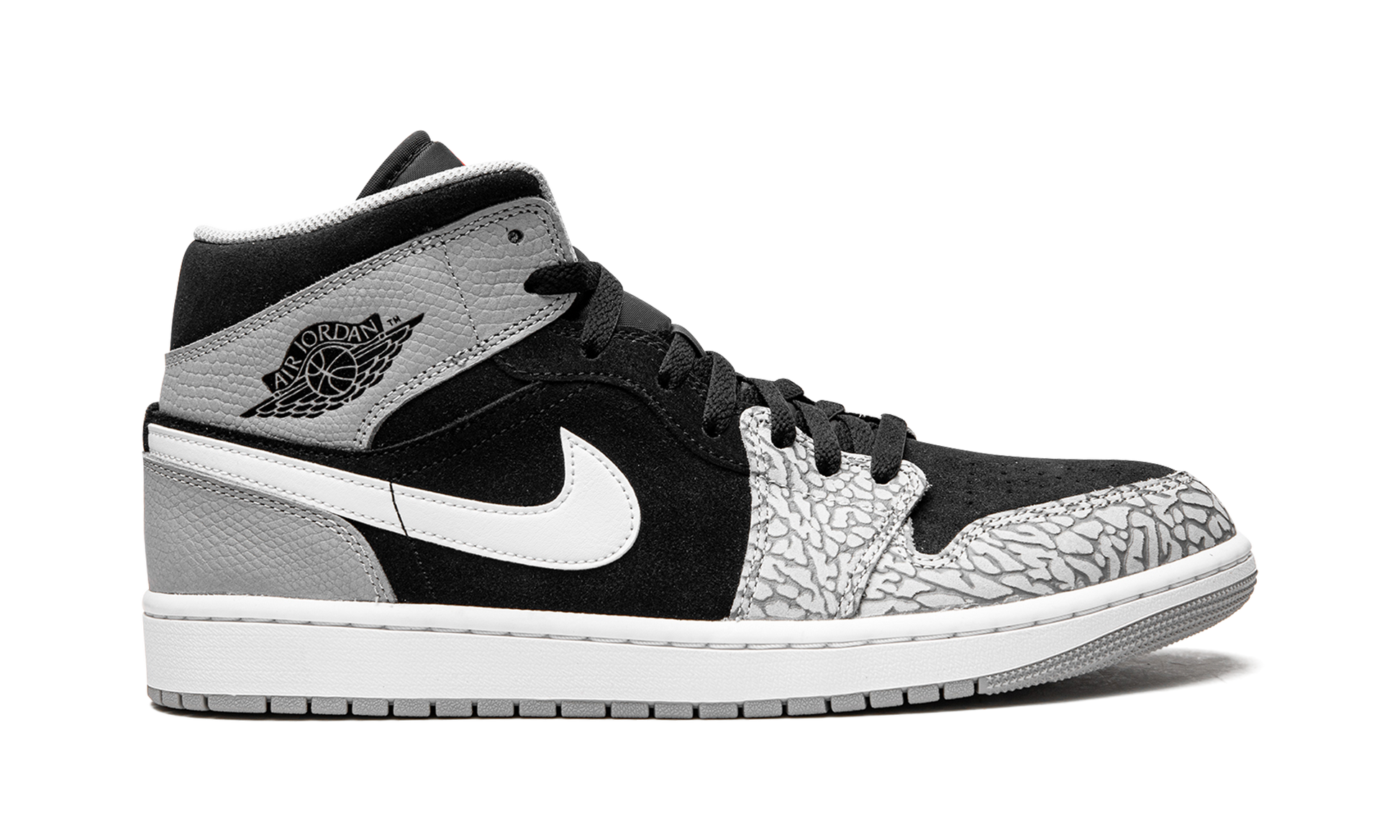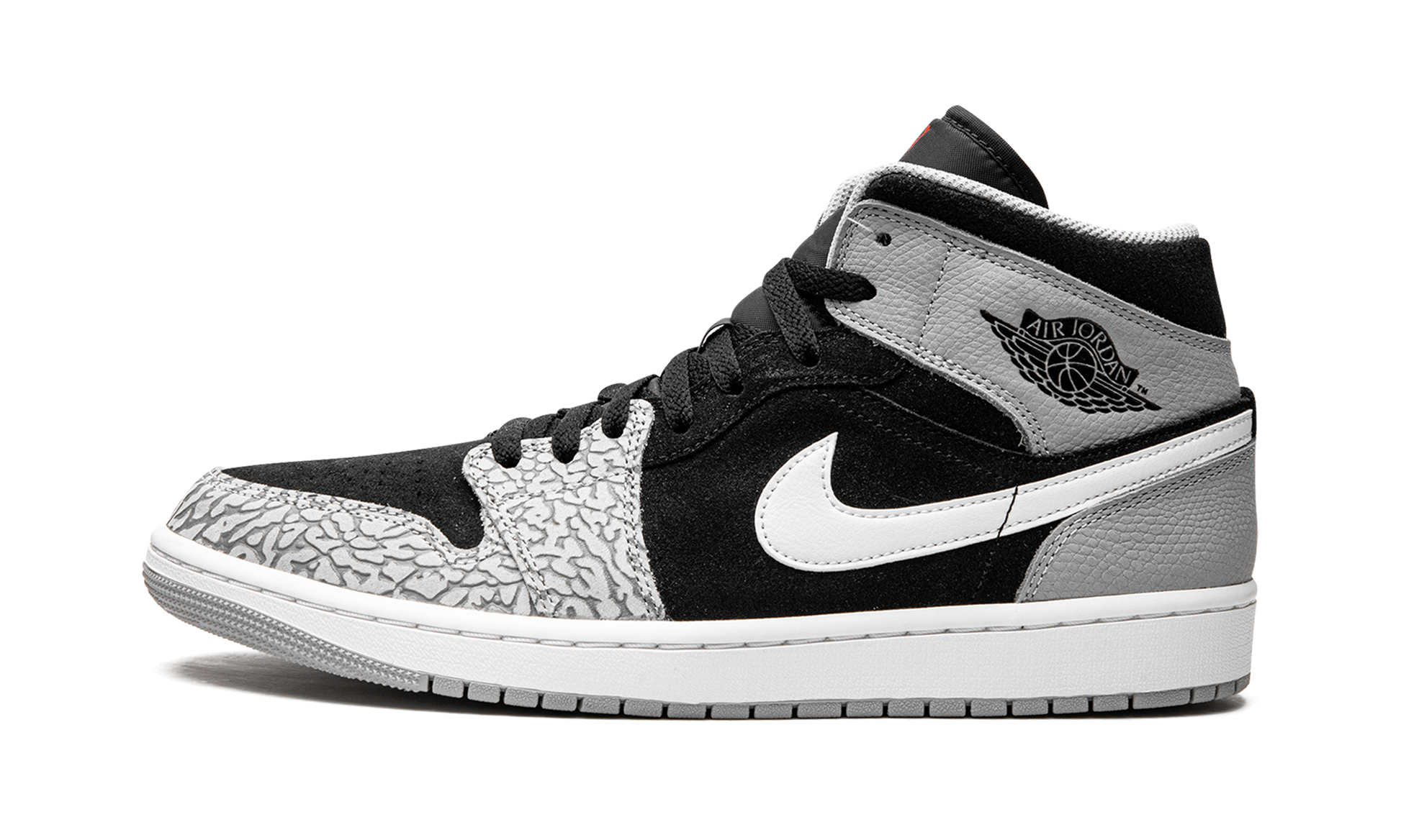 The Air Jordan 1 Mid SE “Elephant Print” is a colorway that combines elements of two classic Air Jordan styles together in one design. The two colorways in question that are featured on the “Elephant Print” are the original Air Jordan 1 “Shadow” and Air Jordan 3 “Black Cement.” The shoe’s black-and-grey color scheme, particularly its black suede base and contrasting grey textured leather collar and heel overlays, is inspired by the look of the “Shadow.” The elephant patterning on the toe cap and forefoot is a nod to the material that appears on several original Jordan 3 colorways from 1988. A white leather Swoosh is found on the mid-panel, and a black “Wings” logo is located on the tongue. Additional branding includes a University Red Jumpman with “Air” detailing on the tongue tag. Elephant Print