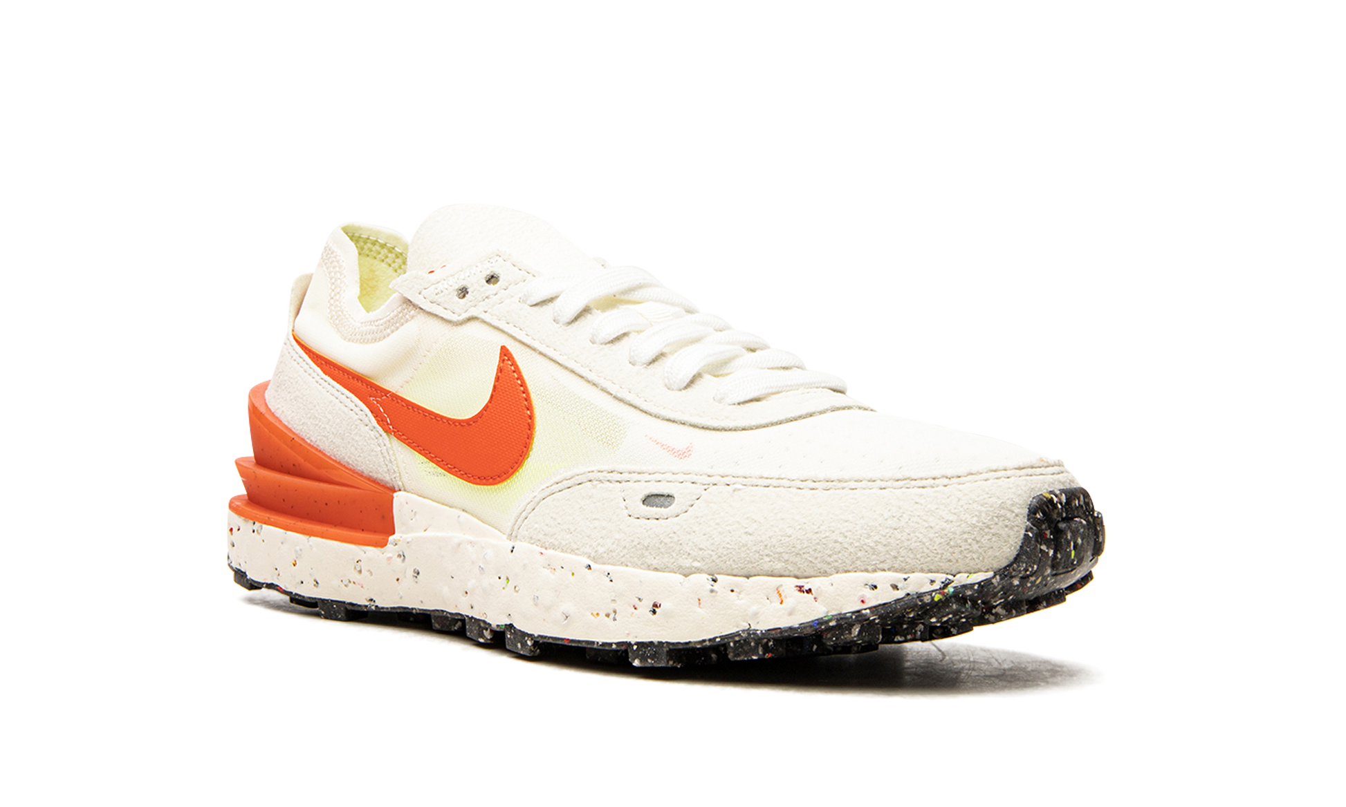 The Nike Waffle One Crater SE is a women's lifestyle shoe that elevates comfort, taking it to the next level. Inspired by Nike's heritage, this pair takes cues from footwear during the Blue Ribbon Sports (BRS) era. You know, before Nike was Nike. The design features an ivory-colored upper with orange details and a transparent mesh panel that lets your socks peek through. The speckled pattern on the midsole is created from Crater Foam, a cushiony material made from Nike Grind rubber and Nike foam materials. A waffle tread and molded lugs make up the rubber outsole. Pale Ivory